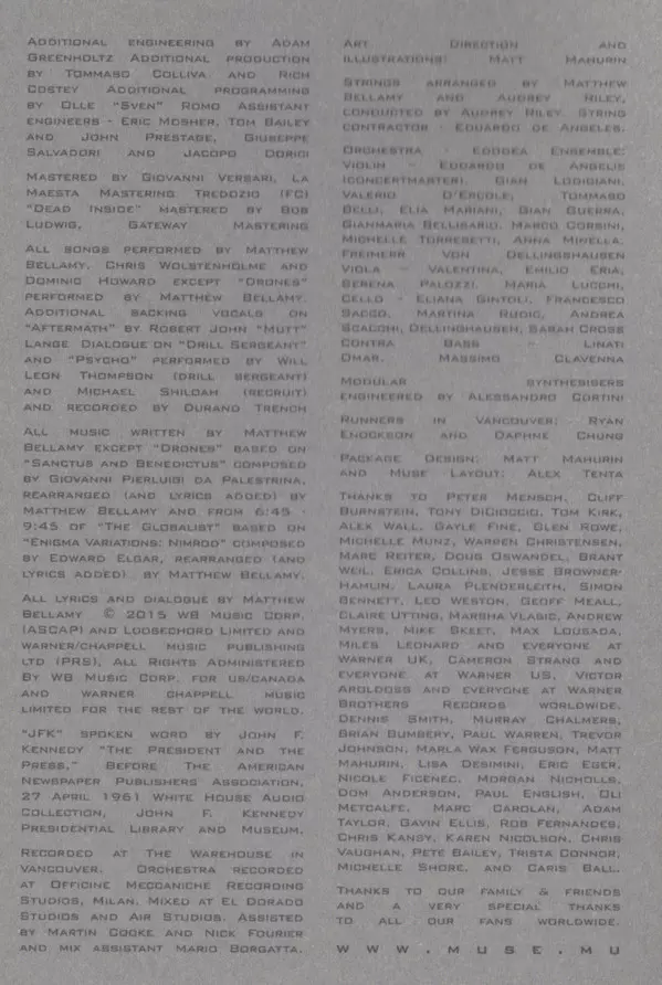 Muse's seventh studio album Drones was released on June 5, 2015. The album was produced by Muse and Robert John "Mutt" Lange. The first single from the album, "Dead Inside", was released on March 23, 2015. The second single from the album, "Psycho", was released on April 27, 2015. The third single from the album, "Mercy", was released on June 1,...