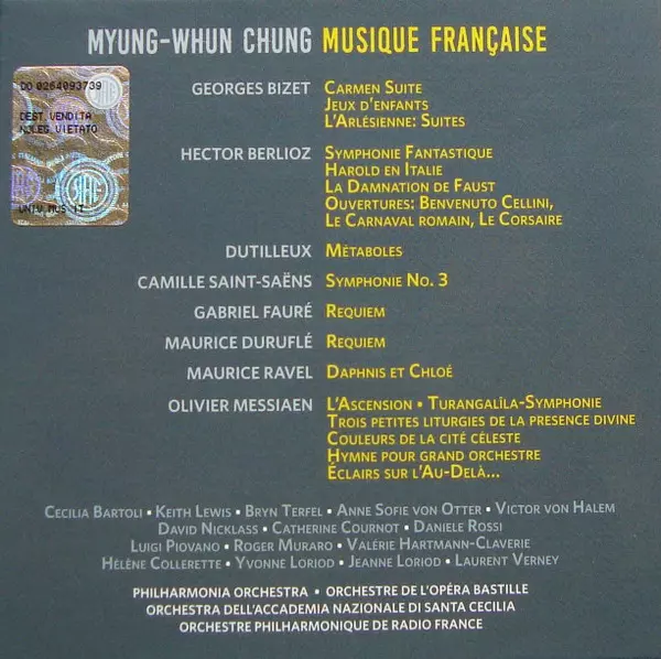 Myung-Whun Chung: Musique Française versión en 11CD/Caja en estándar edición. Esta edición en concreto se lanzó en Europa en la editorial Deutsche Grammophon el día 2. junio 2017. Álbum abarca todos los géneros Música clásica, Modernism, Romance, Ópera, Contemporary classical y Impressionistic.