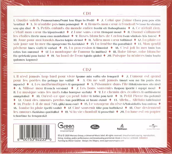 Nana Mouskouri: Les Bons Souvenirs versión en 2CD en estándar edición. Esta edición en concreto se lanzó en Francia en la editorial Mercury en colaboración con Label Panthéon y Universal Music France el día 2. octubre 2020. Álbum abarca todos los géneros Pop, Folk, World, & Country, Balad, Folk y Chanson.