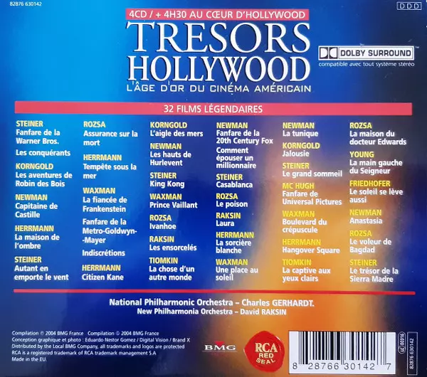 New Philharmonia Orchestra: Tresors Hollywood (L'âge D'or Du Cinéma Américain) versión en 4CD/Caja en estándar edición. Esta edición en concreto se lanzó en Francia en la editorial RCA Red Seal el día 11. octubre 2004. Álbum abarca todos los géneros Pop, Escenario y pantalla, Jazz, Música fácil de escuchar, Partiture, Chanson y Theme.