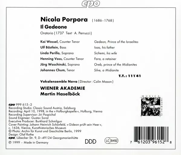 Artista | Kai Wessel | Martin Haselböck | Wiener Akademie | Linda Perillo | Nicola Porpora | Henning Voss | Ulf Bästlein | Johannes Chum | Vokalensemble NOVA | Jörg Waschinski |