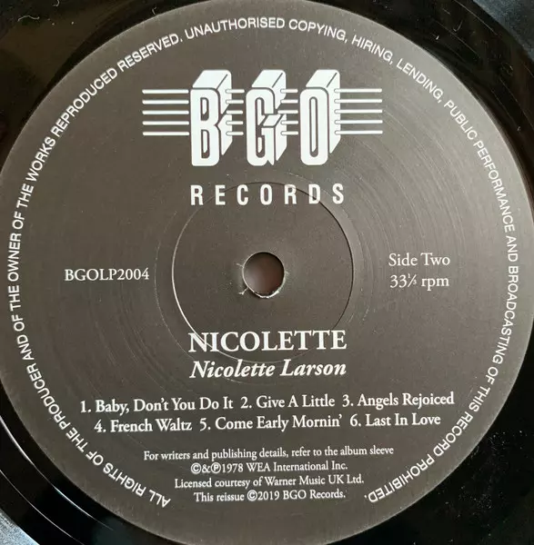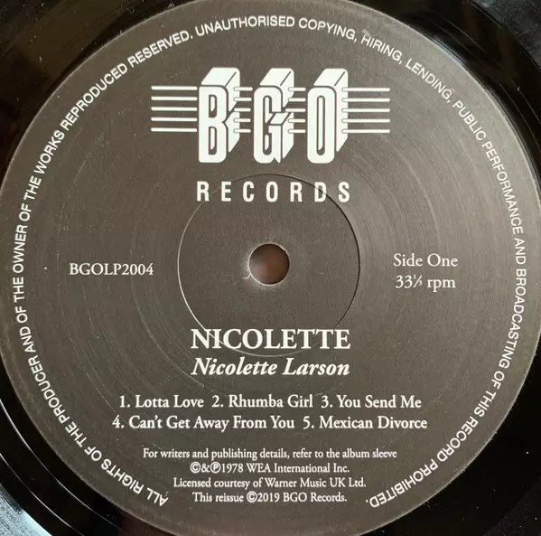 Nicolette Larson: Nicolette versión en vinilo LP en estándar edición. Esta edición en concreto se lanzó en Reino Unido en la editorial BGO Records el día 16. agosto 2019. Álbum abarca todos los géneros Rock, Folk, World, & Country, Funk / Soul, Pop Rock y Soul.