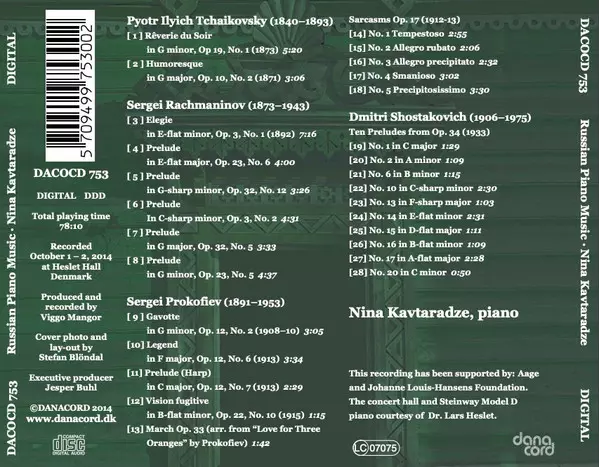 | Artista | Pyotr Ilyich Tchaikovsky | Dmitri Shostakovich | Sergei Prokofiev | Sergei Rachmaninoff | Nina Kavtaradze |
