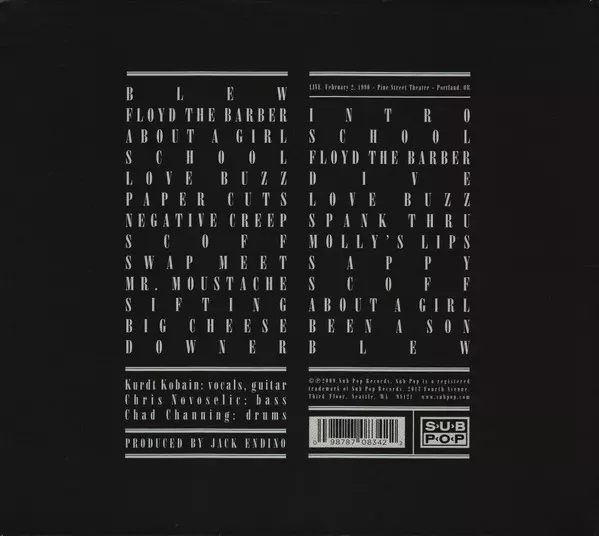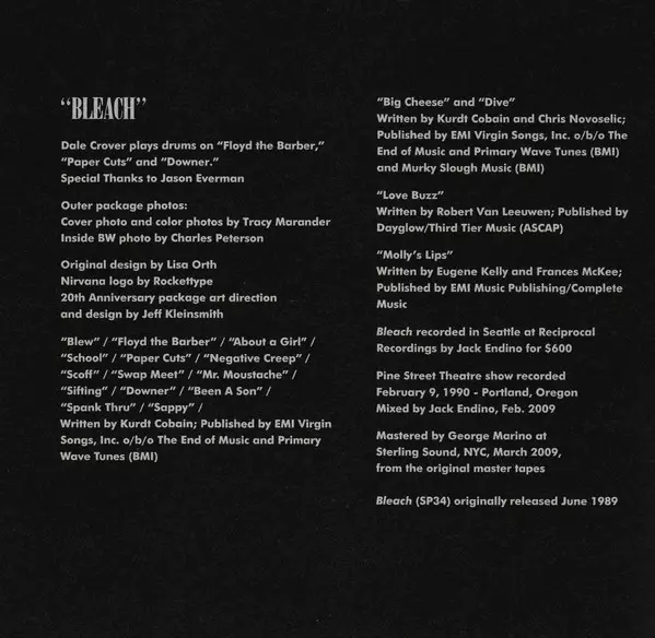 Originally recorded in December 1988 and January 1989 during three sessions with Jack Endino at Seattle's Reciprocal Recording Studios, "Bleach" was released in June 1989 and has remained at the top of Sub Pop's personal best-of list ever since without controversy or surprise. The album was given a boost with NIRVANA's second strong album "Never...