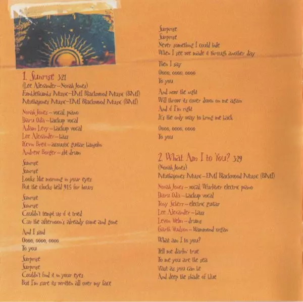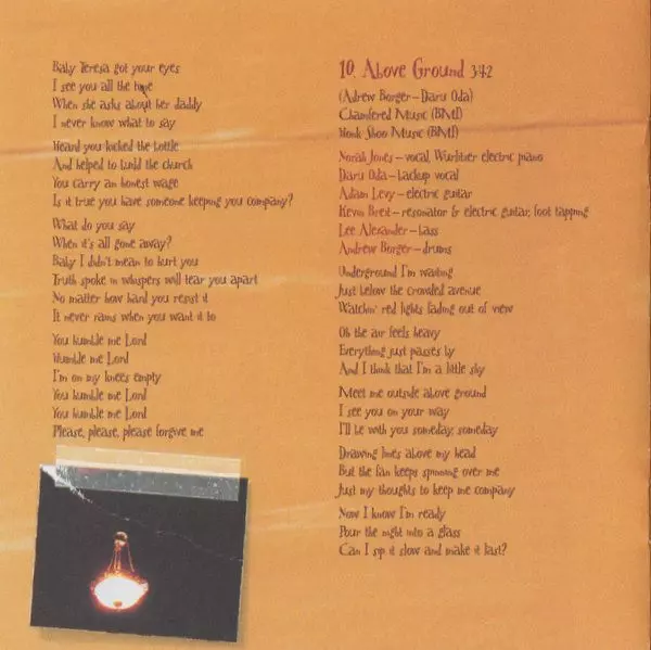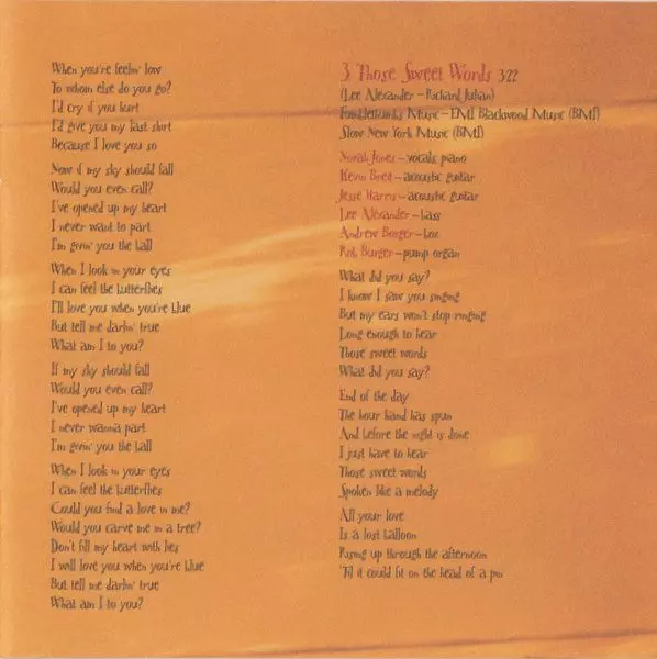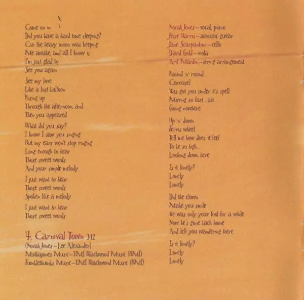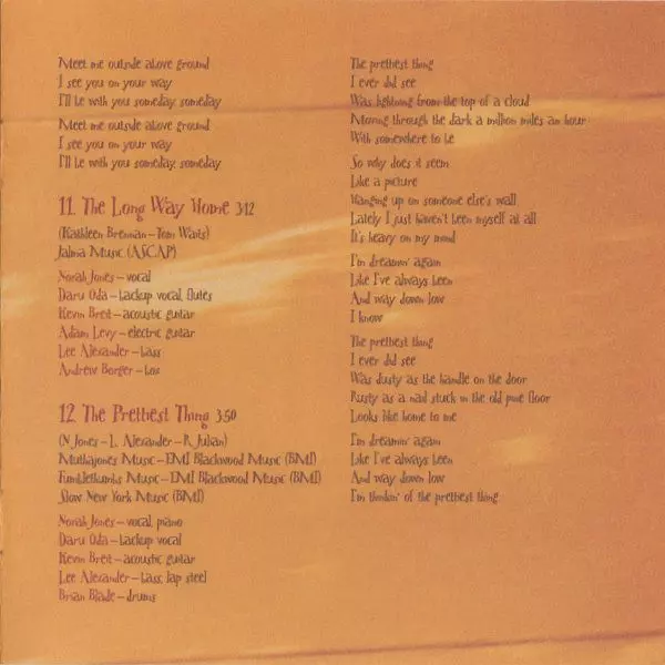 Acoustic Guitar Jesse Harris, Kevin Breit | Bass Lee Alexander | Groovebox [Box] Andrew Borger | Organ [Pump Organ] Rob Burger | Vocals, Piano Norah Jones | Written-By Lee Alexander, Richard Julian
