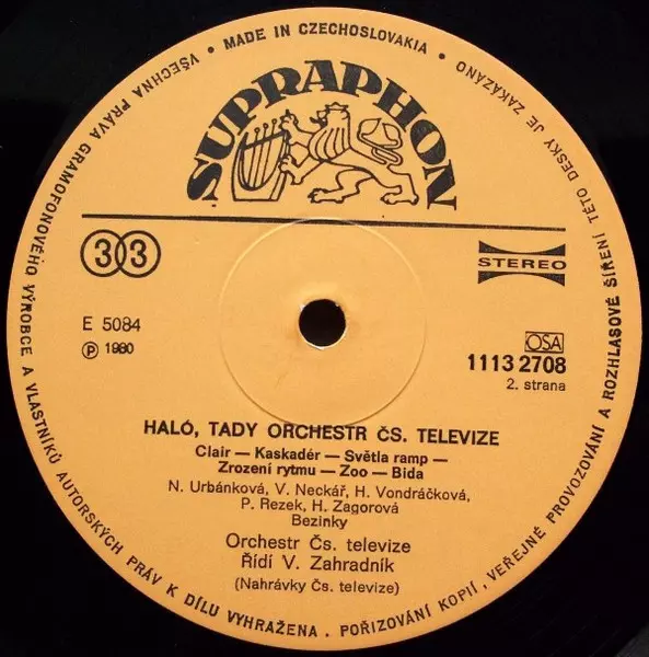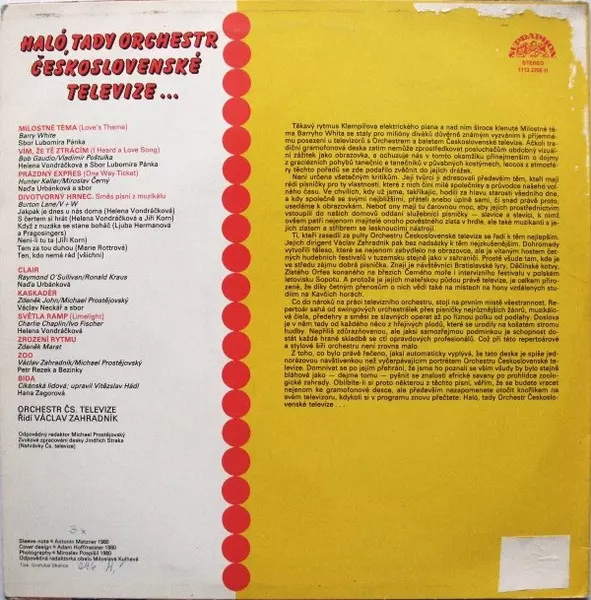 Orchestr Československé Televize: Haló, Tady Orchestr Československé Televize … versión en vinilo LP en estándar edición. Esta edición en concreto se lanzó en Checoslovaquia en la editorial Supraphon del año 1984. Álbum abarca todos los géneros Pop, Funk / Soul, Vocal, Balad, Música fácil de escuchar, Big Band y Disco.