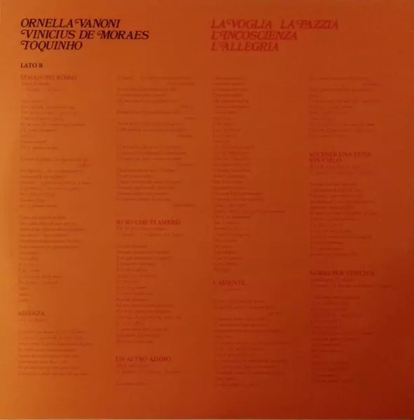 | A6 | Vinicius de Moraes, Toquinho, Ornella Vanoni: La Voglia La Pazzia (Se Ela Quisesse) | 2:52 min | |
