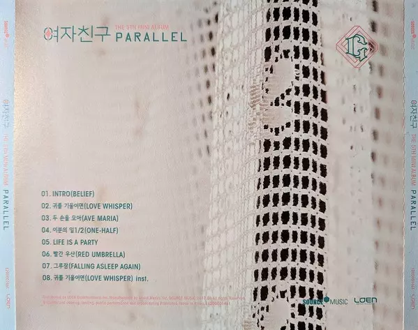 GFriend: Parallel versión en CD en estándar edición. Esta edición en concreto se lanzó en Corea del Sur en la editorial Source Music (4) en colaboración con Loen Entertainment el día 11. agosto 2017. Álbum abarca todos los géneros Pop, Música electrónica, Balad, House, Synth-Pop, Dance-pop, Disco, Bubblegum y K-pop. Whisper Version.