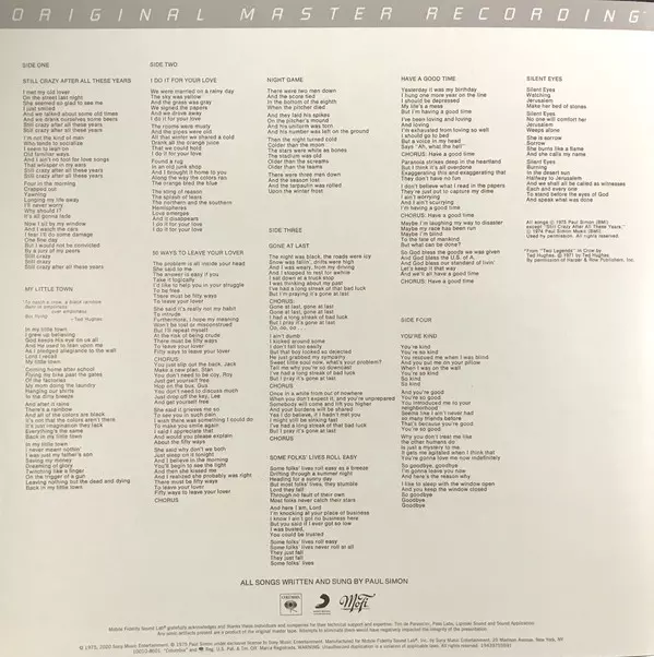 The album Still Crazy After All These Years, released in 1975 on Paul Simon , is a masterpiece. The album is a blend of folk, rock and jazz, and Simon's lyrics are as heartfelt as ever. Highlights of the album include the title track, "My Little Town" and "50 Ways to Leave Your Lover". The album Still Crazy After All These Years is a must listen...
