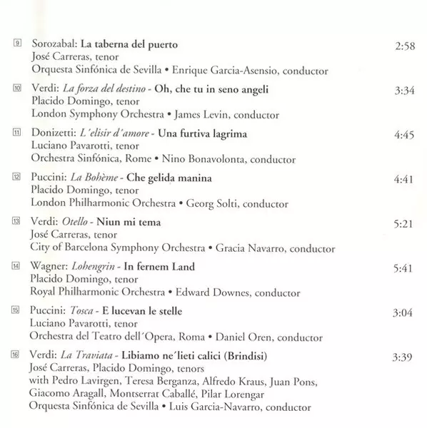 | 16 | Teresa Berganza, José Carreras, Montserrat Caballé, Alfredo Kraus, Placido Domingo, Juan Pons, Pilar Lorengar, Giacomo Aragall, Pedro Lavirgen: La traviata - Libiamo ne' lieti calici (Brindisi) | 3:39 min | |