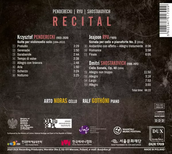 | Artista | Dmitri Shostakovich | Krzysztof Penderecki | Arto Noras | Ralf Gothóni | Jeajoon Ryu |