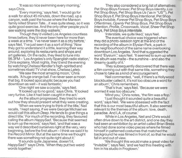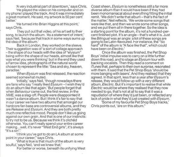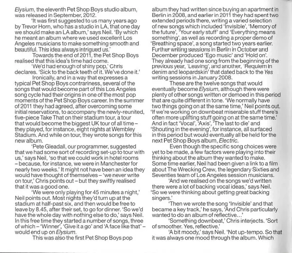 The Pet Shop Boys' album Elysium was released in 2012. It is a pop album with electronic influences. The album has a very upbeat and positive feel, with many catchy and danceable tracks. The lyrics are often about love and happiness. The album was very well received by critics and fans and was a commercial success.