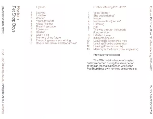 Pet Shop Boys: Elysium / Further Listening 2011–2012 versión en 2CD en remasterizado edición. Esta edición en concreto se lanzó en Europa en la editorial Parlophone el día 20. octubre 2017.