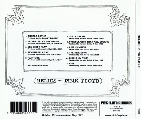 Dlouhé čekání je konečně u konce:Vydáním alb "Relics", "More" a "Obscured By Clouds" byl kompletně digitálně remasterován katalog PINK FLOYD. Kompilace "Relics", která poprvé vyšla v roce 1971 a nyní je poprvé oficiálně k dispozici na CD, zaujme nejen ucho, ale i oko .Seznam skladeb obsahuje dva rané hity z britské Top 20 "Arnold Layne" a "See E...