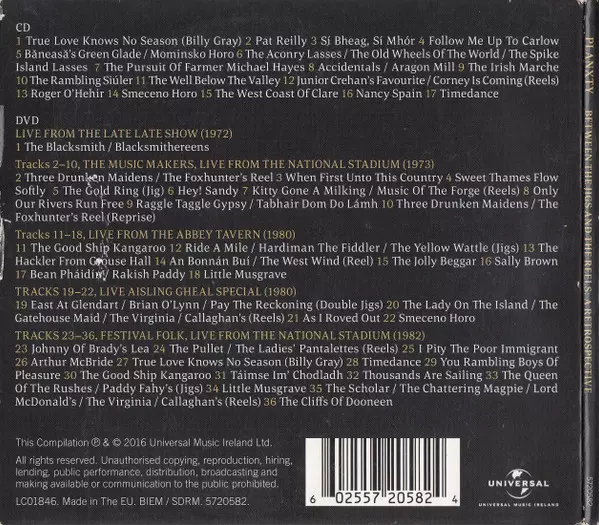Planxty: Between The Jigs And The Reels: A Retrospective versión en CD/DVD en estándar edición. Esta edición en concreto se lanzó en Irlanda en la editorial Universal Music Ireland el día 22. abril 2019. Álbum abarca todos los géneros Folk, World, & Country, Folk y Música celta.