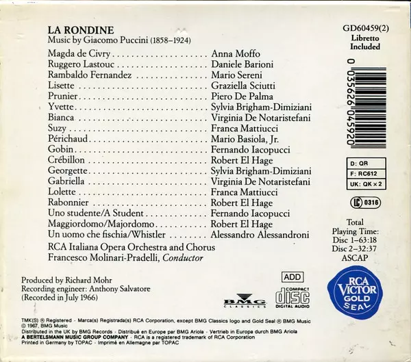 | Artista | Giacomo Puccini | Anna Moffo | Graziella Sciutti | Mario Sereni | Francesco Molinari-Pradelli | RCA Italiana Opera Orchestra | RCA Italiana Opera Chorus | Piero De Palma | Daniele Barioni |