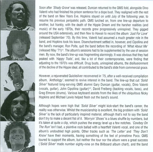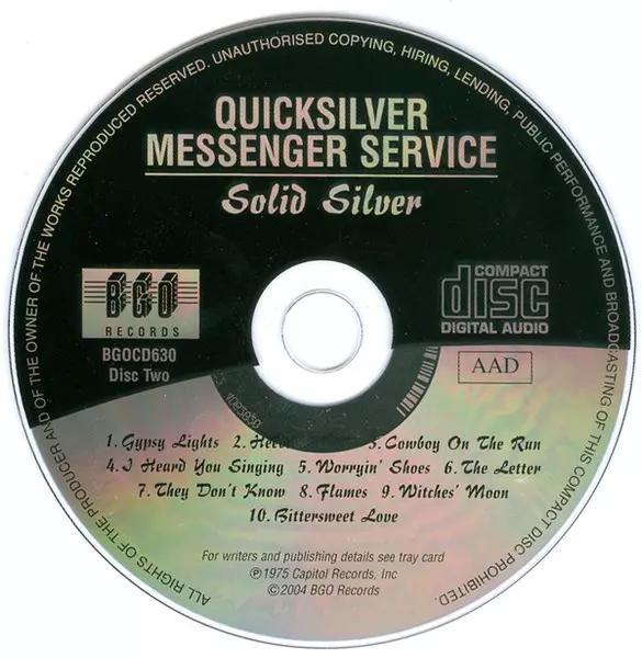 Quicksilver Messenger Service: Shady Grove / Solid Silver versión en 2CD en estándar edición. Esta edición en concreto se lanzó en Reino Unido en la editorial BGO Records el día 9. noviembre 2004. Álbum abarca todos los géneros Rock, Psychedelic rock y Classic Rock.