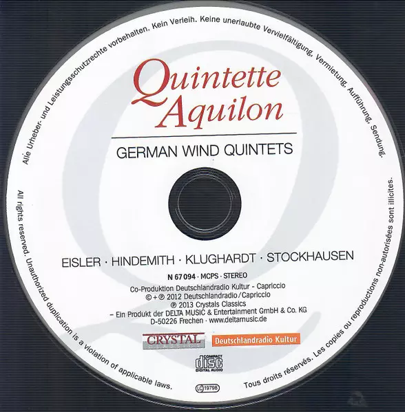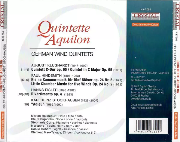 | Artista | Paul Hindemith | Karlheinz Stockhausen | Hanns Eisler | August Klughardt | Quintette Aquilon |