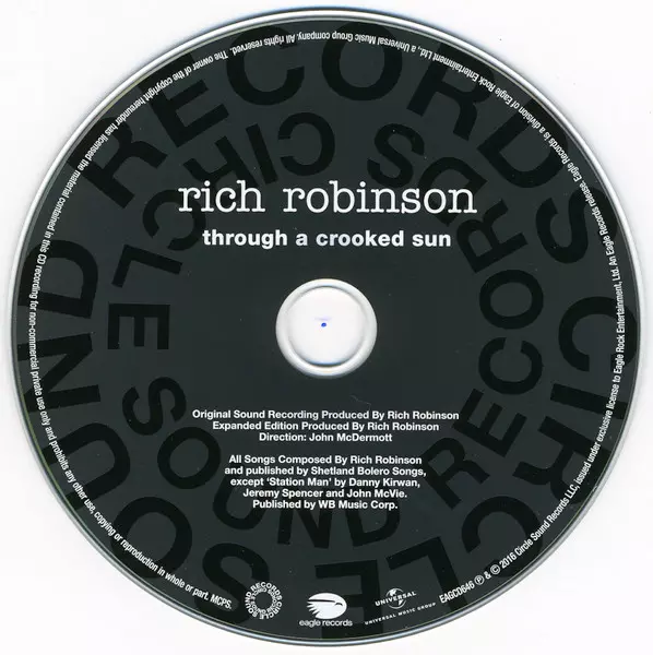 Rich Robinson: Through A Crooked Sun versión en CD en estándar edición. Esta edición en concreto se lanzó en Europa en la editorial Eagle Records en colaboración con Circle Sound Records y Universal Music Group el día 22. abril 2016. Álbum abarca todos los géneros Rock, Folk, World, & Country, Folk, Folk Rock y Blues-Rock.