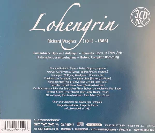 Richard Wagner: Lohengrin versión en 3CD en estándar edición. Esta edición en concreto se lanzó en Alemania en la editorial ZYX Music el día 5. febrero 2013. Álbum abarca todos los géneros Música clásica, Romance y Ópera.