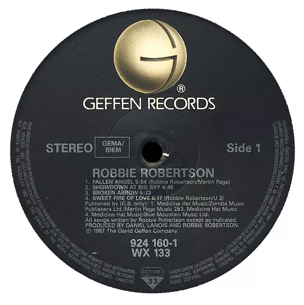 Robbie Robertson: Robbie Robertson versión en vinilo LP en estándar edición. Esta edición en concreto se lanzó en Europa y Reino Unido en la editorial Geffen Records del año 1987. Álbum abarca todos los géneros Rock y Pop Rock.