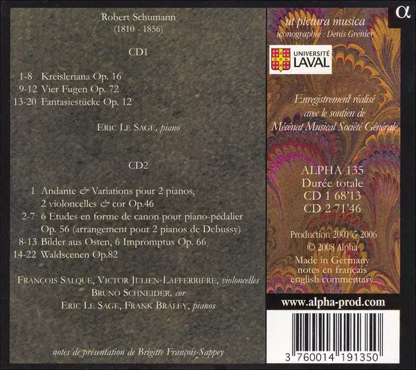 | Artista | Robert Schumann | Éric Le Sage | Bruno Schneider | Frank Braley | Victor Julien-Laferrière | François Salque |