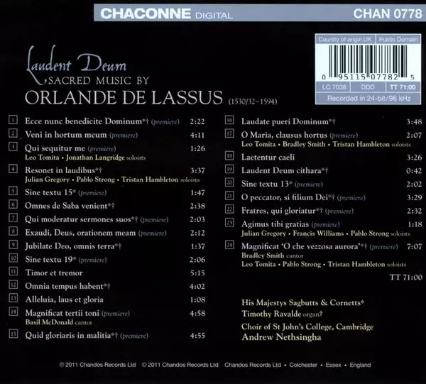 | Artista | St. John's College Choir | Roland de Lassus | Andrew Nethsingha | His Majestys Sagbutts And Cornetts |