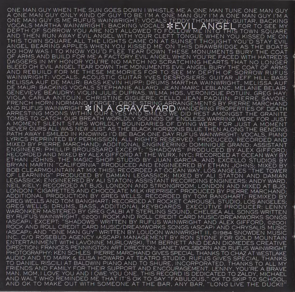 Acoustic Guitar, Dobro, Piano, Vocals Rufus Wainwright | Backing Vocals Julianna Raye, Martha Wainwright, Teddy Thompson | Bass, Backing Vocals Jeff Hill | Chamberlin, Electric Piano [Wurlitzer], Electric Organ [Hammond B3], Backing Vocals Richard Causon | Drums, Percussion Butch Norton | Electric Guitar Ethan Johns | Mixed By Bob Clearmountain | Producer, Engineer Ethan Johns