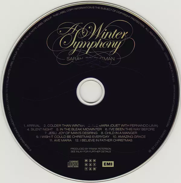 Sarah Brightman: A Winter Symphony versión en CD en estándar edición. Esta edición en concreto se lanzó en Europa en la editorial Manhattan Records en colaboración con EMI el día 7. noviembre 2008.