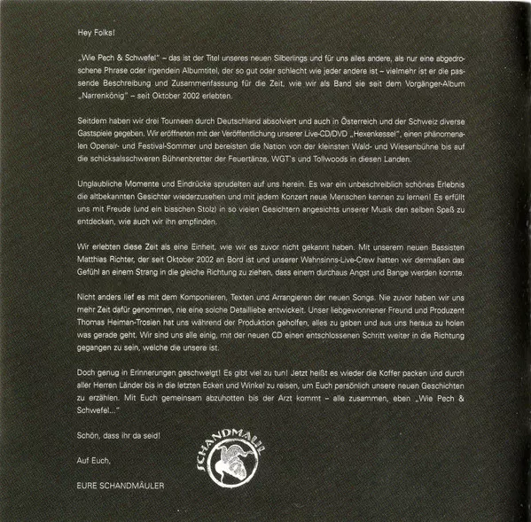 Schandmaul: Wie Pech & Schwefel DIGI versión en CD en digipack edición. Esta edición en concreto se lanzó en Alemania, Austria y Suiza en la editorial F.A.M.E. Recordings el día 17. enero 2005. Álbum abarca todos los géneros Rock, Música clásica, Folk Rock y Medieval. Digipack.