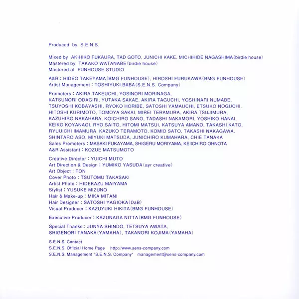 S.E.N.S. is a duo group specializing in electronic new age music and soundtrack in Japan. Composed of 深浦昭彦 and 勝木ゆかり . Formed in 1988, Instrumental unit. Are responsible for a large number of music, such as CM movie, TV documentaries, and drama. Abbreviation of Sound. Earth. Nature...