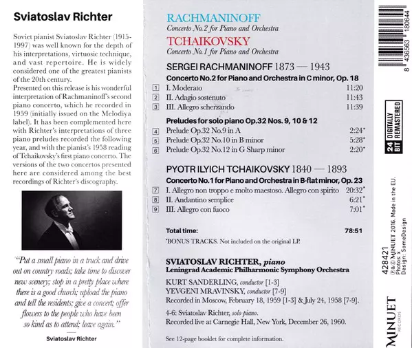 | Artista | Herbert von Karajan | Pyotr Ilyich Tchaikovsky | Sergei Vasilyevich Rachmaninoff | Sviatoslav Richter | Stanislaw Wislocki |