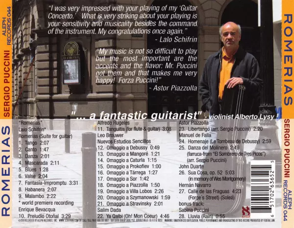 Sergio Puccini: Romerias versión en CD en estándar edición. Esta edición en concreto se lanzó en EE.UU. en la editorial Aleph Records el día 12. febrero 2021. Álbum abarca todos los géneros Música clásica y Modernism.