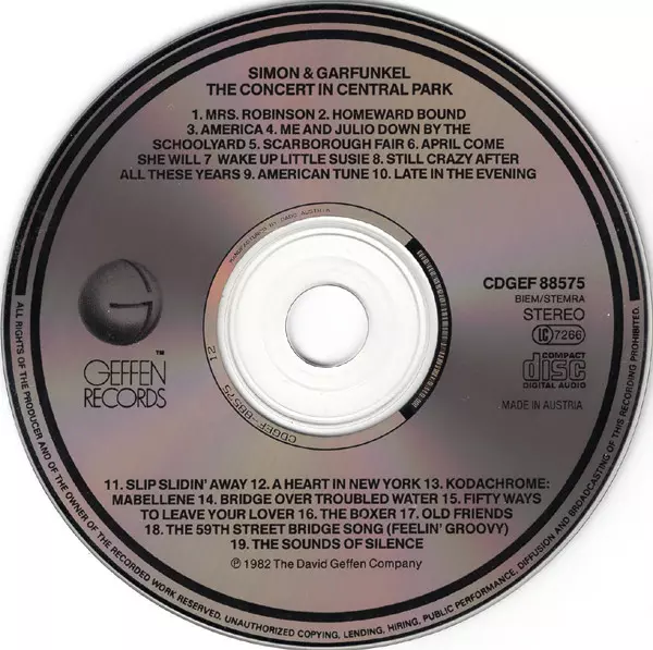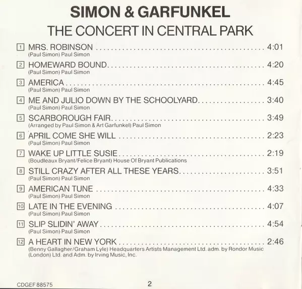 "Concert In Central Park" is SIMON & GARFUNKEL's first live album, originally released in February 1982. The concert was recorded at a free benefit in September 1981, where they performed for over 500,000 people. Proceeds were used for the upkeep of Central Park. The concert and album marked the beginning of a brief reunion between PAUL SIMON an...