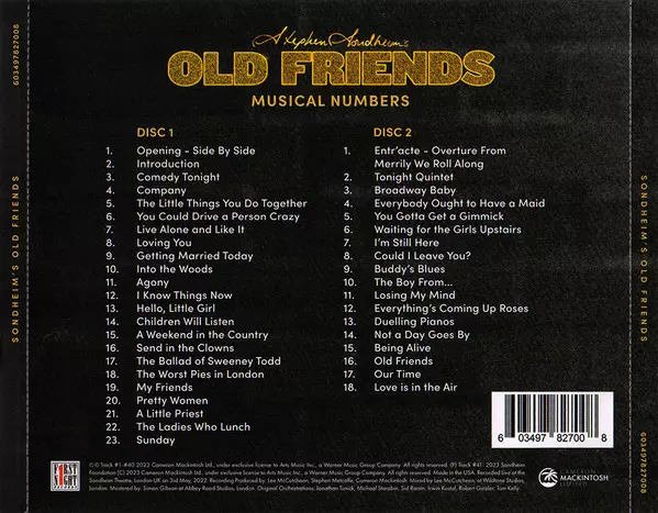 "Sondheim's Old Friends: A Celebration" Concert Cast: Sondheim's Old Friends: A Celebration (The Star Studded Gala, Live At The Sondheim 3 May 2022) versión en 2CD en estándar edición. Esta edición en concreto se lanzó en EE.UU. en la editorial First Night Records en colaboración con Cameron Mackintosh Limited el día 26. julio 2024. Álbum abarca todos los géneros Escenario y pantalla y Musical.