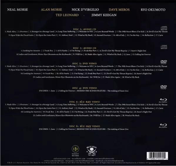 Spock's Beard: Snow Live DLX | LTD versión en 2CD/2DVD/2Blu-ray en deluxe de edición limitada edición. Esta edición en concreto se lanzó en Europa y Estados Unidos en la editorial Radiant Records (2) en colaboración con Metal Blade Records el día 24. noviembre 2017. Álbum abarca todos los géneros Rock y Progressive rock. Limited Boxset Deluxe Edition.