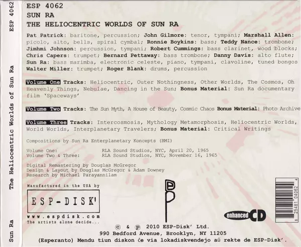 Sun Ra: The Heliocentric Worlds Of Sun Ra versión en 3CD en remasterizado edición. Esta edición en concreto se lanzó en EE.UU. en la editorial ESP Disk el día 10. febrero 2017. Álbum abarca todos los géneros Jazz, Avant-garde Jazz y Free Jazz.