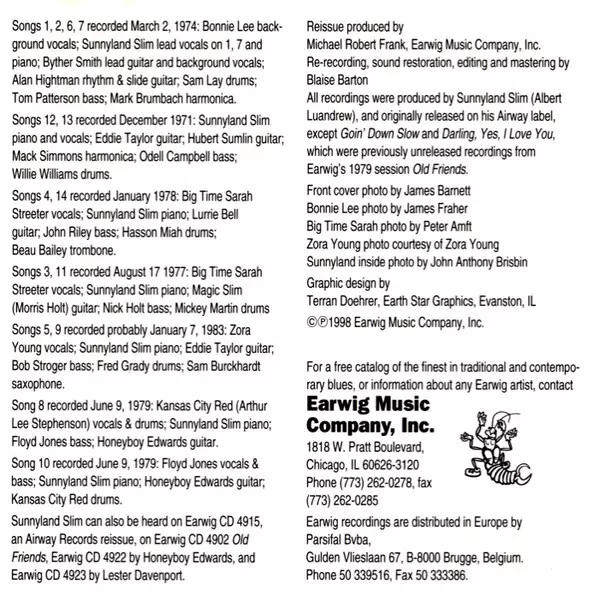 Backing Vocals [Background Vocals] Bonnie Lee | Bass Tom Patterson (5) | Drums Sam Lay | Harmonica Mark Brumbach | Lead Guitar, Backing Vocals [Background Vocals] Byther Smith | Lead Vocals, Piano Sunnyland Slim | Rhythm Guitar, Slide Guitar Alan Hightman | Written-By Albert Luandrew