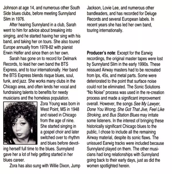 Bass Bob Stroger | Drums Fred Grady | Guitar Eddie Taylor (2) | Piano Sunnyland Slim | Saxophone Sam Burckhardt | Vocals Zora Young | Written-By Zora Young