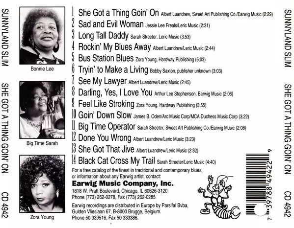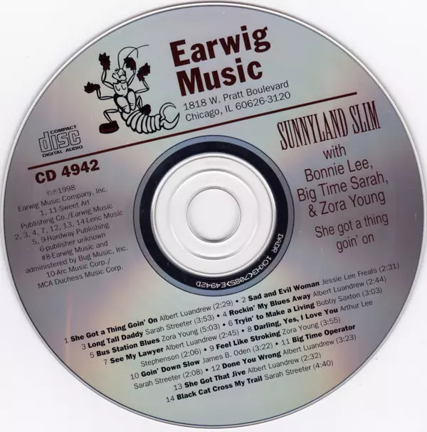 Sunnyland Slim: She Got A Thing Goin' On versión en CD en estándar edición. Esta edición en concreto se lanzó en EE.UU. en la editorial Earwig Music el día 1. marzo 2019. Álbum abarca todos los géneros Blues, Chicago Blues y Piano Blues.