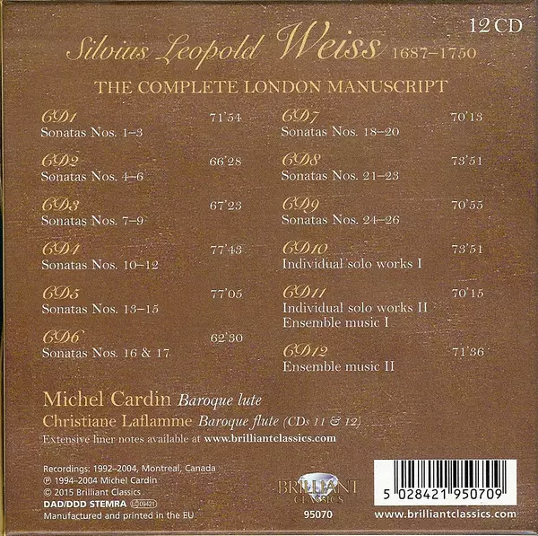 Sylvius Leopold Weiss: The Complete London Manuscript versión en 12CD/Caja en estándar edición. Esta edición en concreto se lanzó en Europa en la editorial Brilliant Classics el día 24. febrero 2015. Álbum abarca todos los géneros Música clásica y Música barroca.