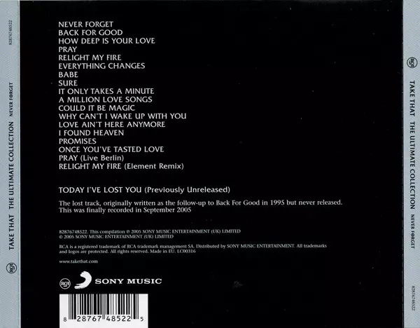 Take That: The Ultimate Collection - Never Forget versión en CD en estándar edición. Esta edición en concreto se lanzó en Reino Unido en la editorial RCA en colaboración con Sony Music. Álbum abarca todos los géneros Pop, Música electrónica, Funk / Soul, Balad, House, Soul, Disco y Europop.