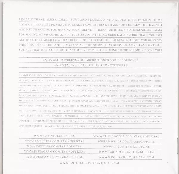 Arranged By [Orchestral], Arranged By [Choir] Jim Dooley | Bass Doug Wimbish | Drums Mike Terrana | Electric Guitar, Acoustic Guitar Alex Scholpp | Keyboards Christian Kretschmar, Guillermo De Medio, Tim Palmer | Lead Vocals, Backing Vocals, Piano, Written-By Tarja Turunen | Written-By Angela Heldmann, Eric Nyholm