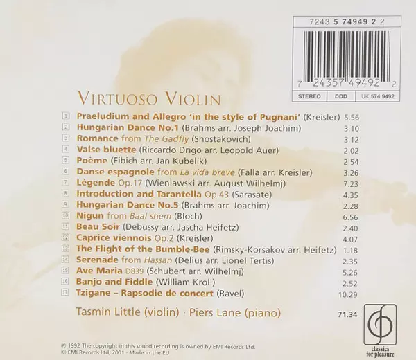 Piers Lane: Virtuoso Violin versión en CD en estándar edición. Esta edición en concreto se lanzó en Europa en la editorial EMI Records Ltd. en colaboración con Classics For Pleasure el día 2. abril 2002. Álbum puede clasificarse como género Música clásica.