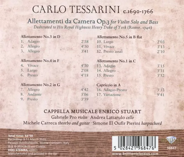 | Allettamenti Da Camera Op.3 For Violin Solo And Bass, Dedictated To His Royal Highness Henry Duke Of York (Rome, 1740) | ||