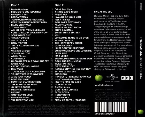 The Beatles: Live At The BBC DIGI versión en 2CD en remasterizado digipack edición. Esta edición en concreto se lanzó en Europa y Reino Unido en la editorial Apple Records en colaboración con Universal Music Catalogue y BBC el día 11. noviembre 2013.