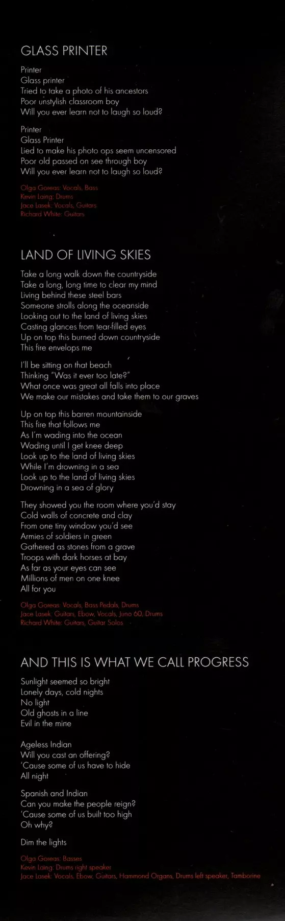 E-Bow, Vocals, Synthesizer [Juno 60], Drums Jace Lasek | Guitar [Guitars, Guitar Solos] Richard White (3) | Vocals, Bass [Bass Pedals], Drums Olga Goreas