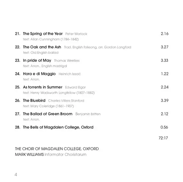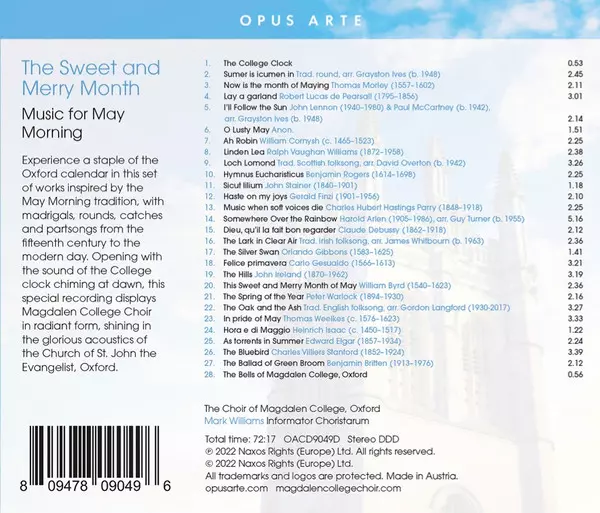 Magdalen College Choir Oxford: The Sweet And Merry Month (Music For May Morning) versión en CD en estándar edición. Esta edición en concreto se lanzó en la editorial Opus Arte el día 22. abril 2022. Álbum abarca todos los géneros Música clásica, Música barroca, Modernism, Romance, Contemporary classical y Renaissance Music.