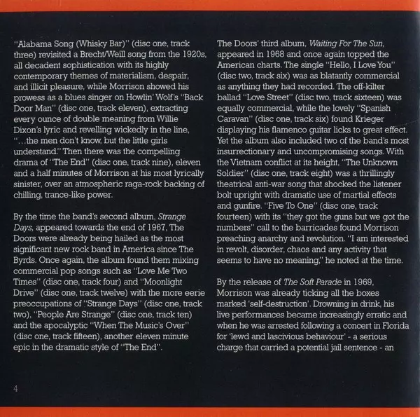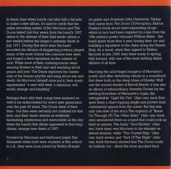 Four decades after The Doors were founded, "The Very Best Of The Doors" provides a condensed look at one of the most daring and influential bands in rock history. The album is released on a single CD with 20 tracks and a double CD with 34 songs. On both formats you'll find classic tracks like "Break On Through", "Hello, I Love You", "Riders On T...