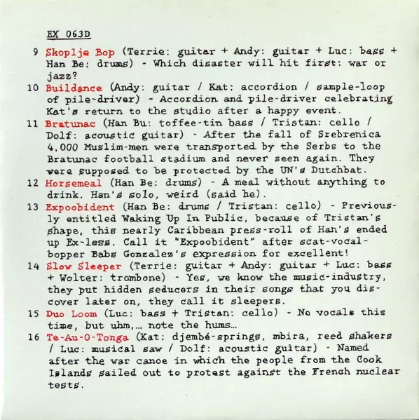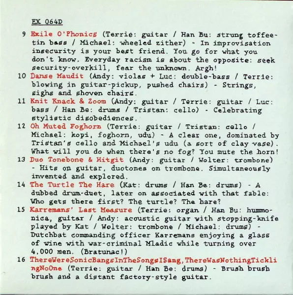 Acoustic Guitar [With Stopping-knife] Andy Ex | Drums Michael Vatcher | Guitar, Performer [Hummonica] Han Buhrs | Organ Terrie Ex | Performer [Stopping-knife On Acoustic Guitar] Katrin Ex